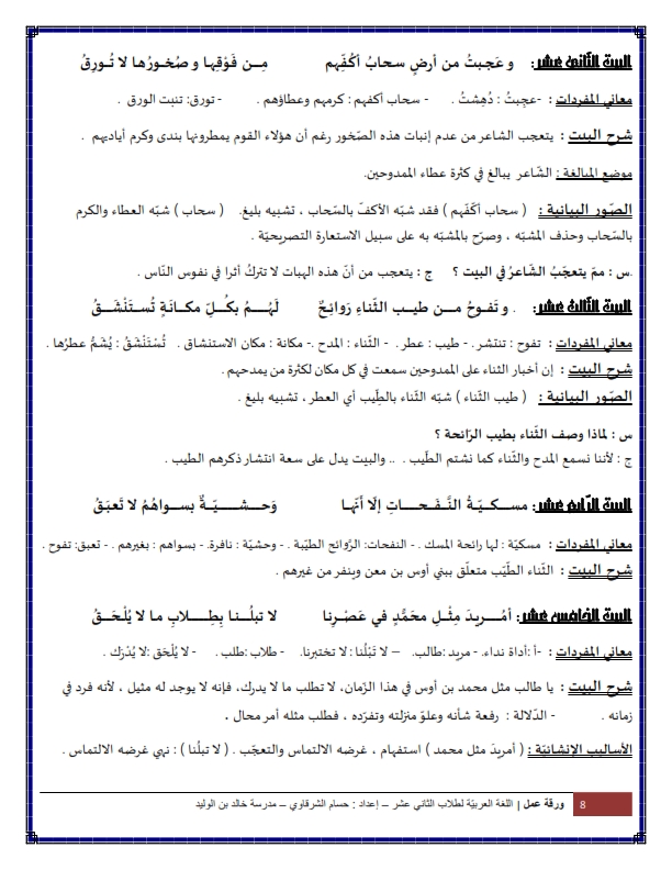 شرح وتحليل واجابات قصيدة ارق علي ارق في اللغة العربية للصف الثاني عشر الفصل الدراسي الاول