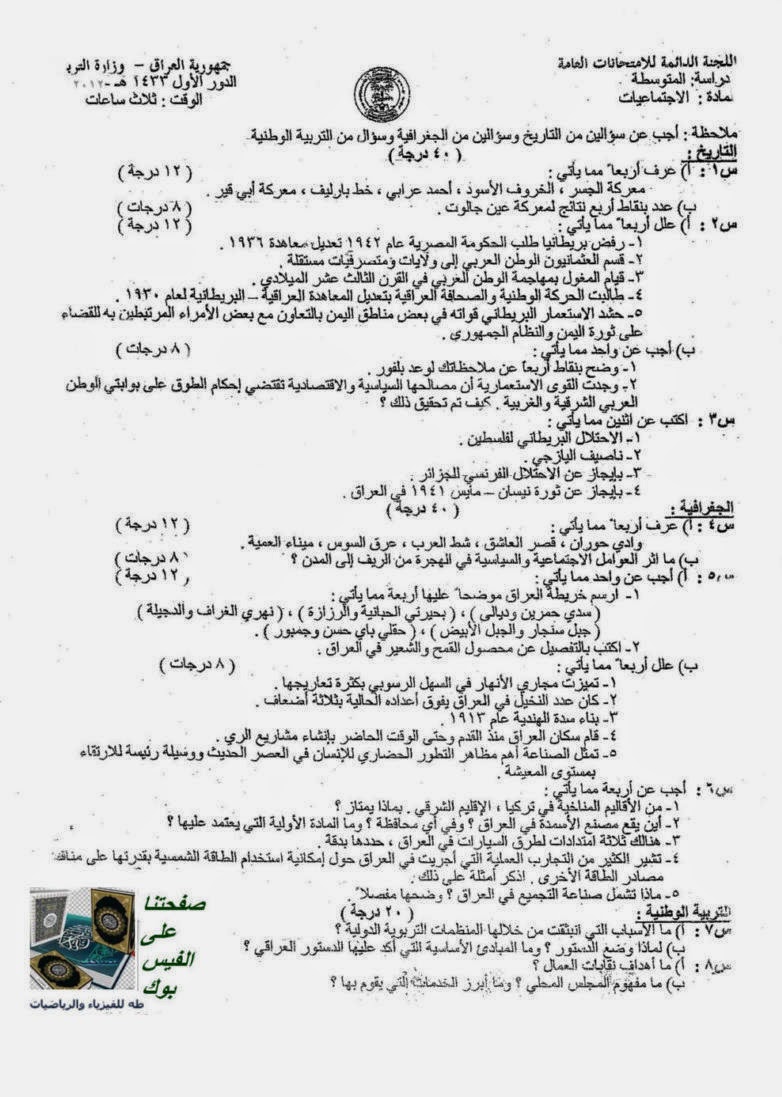 الأسئلة الوزارية مادة الاجتماعيات الثالث المتوسط الدور الأول 2016 الثلاثاء 7 6 2016 منتديات درر العراق