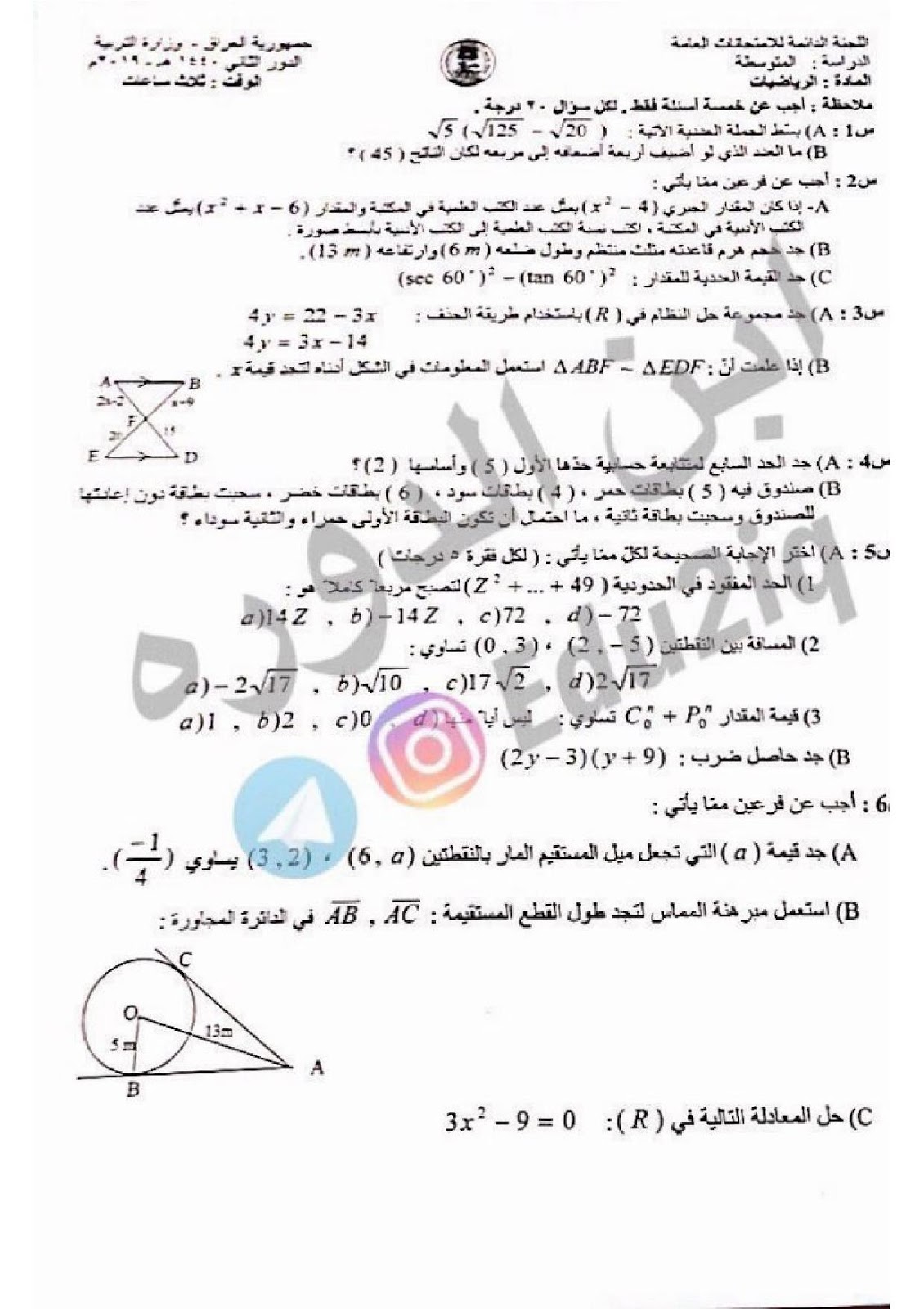 اسئلة الرياضيات للصف الثالث المتوسط نازحين الموصل 2017 الدور الاول هاشتاك نت
