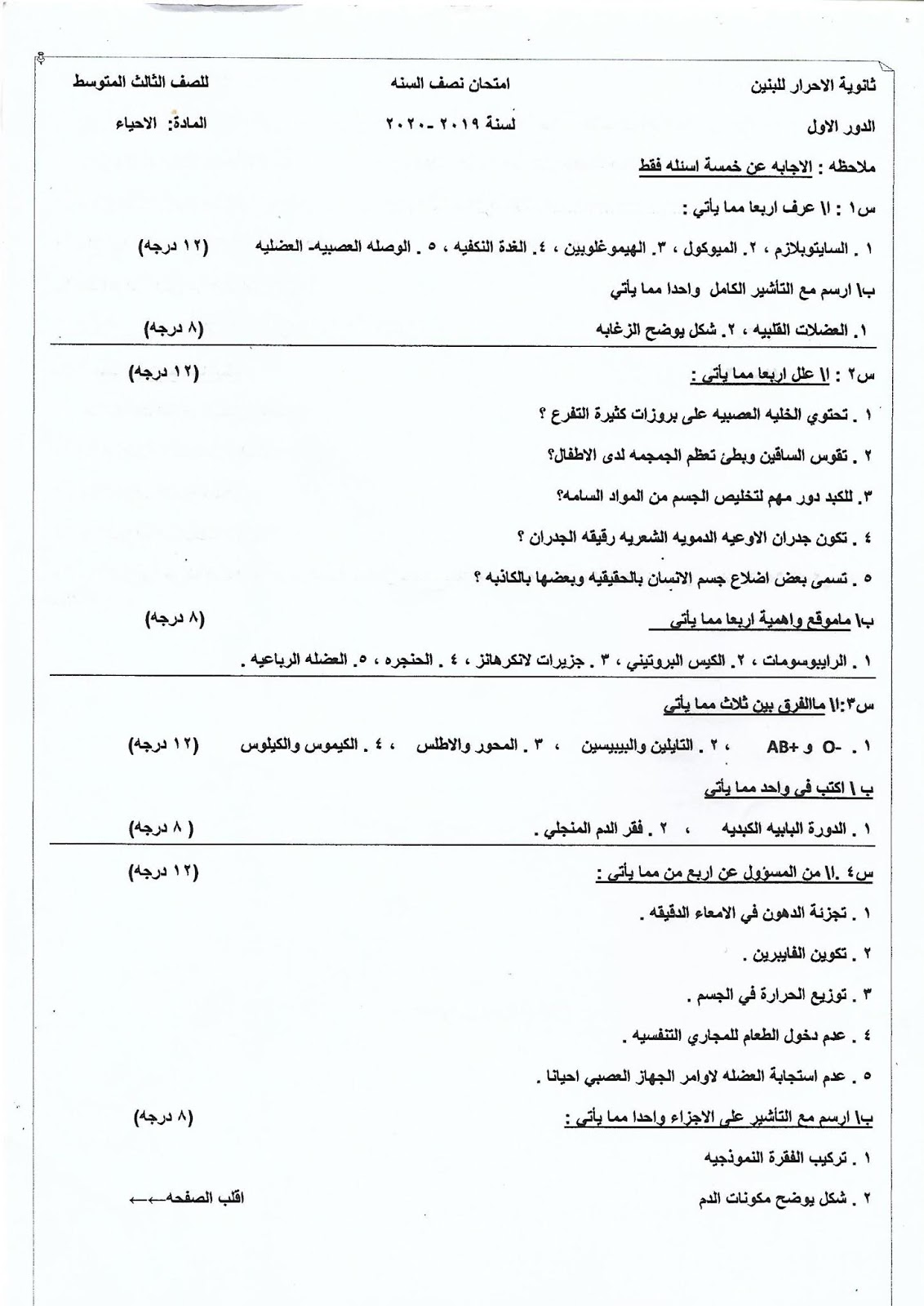 اسئلة الاحياء ثالث متوسط 2020 نصف السنة الدراسة المتوسطة