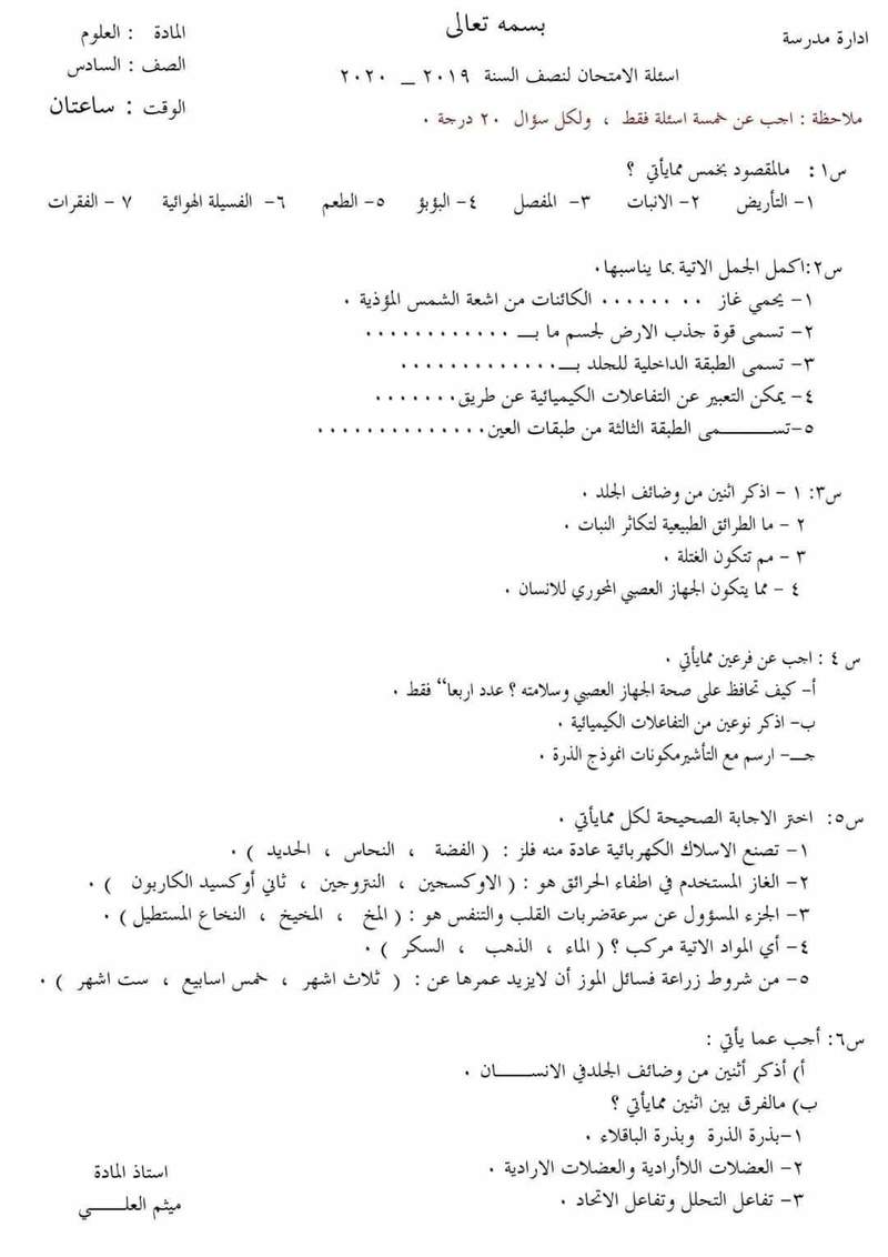 اسئلة علوم سادس ابتدائي الفصل الاول
