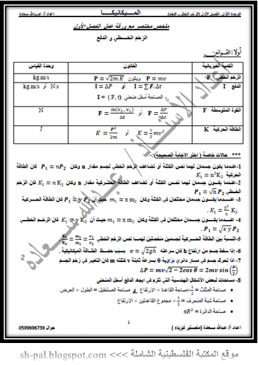 ملخص مختصر مع ورقة عمل لدرس الزخم الخطي والدفع للصف الثاني عشر المكتبة الفلسطينية الشاملة