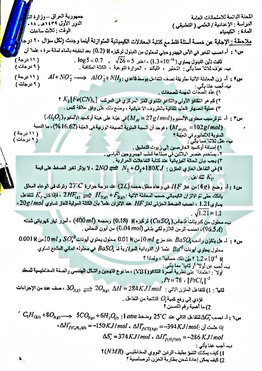اسئلة الكيمياء السادس التطبيقي 2018 الدور الاول ملازمنا