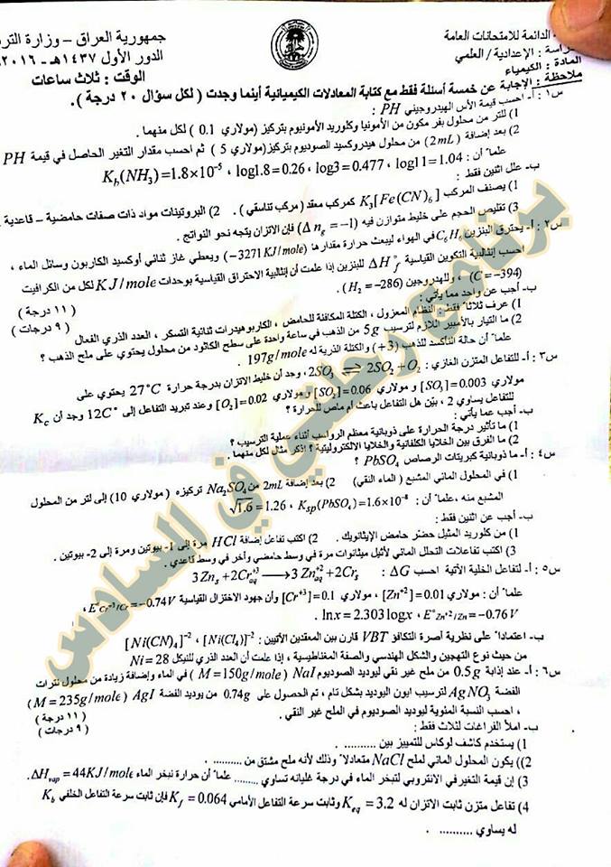 اسئلة الكيمياء للسادس علمي 2016 دور اول