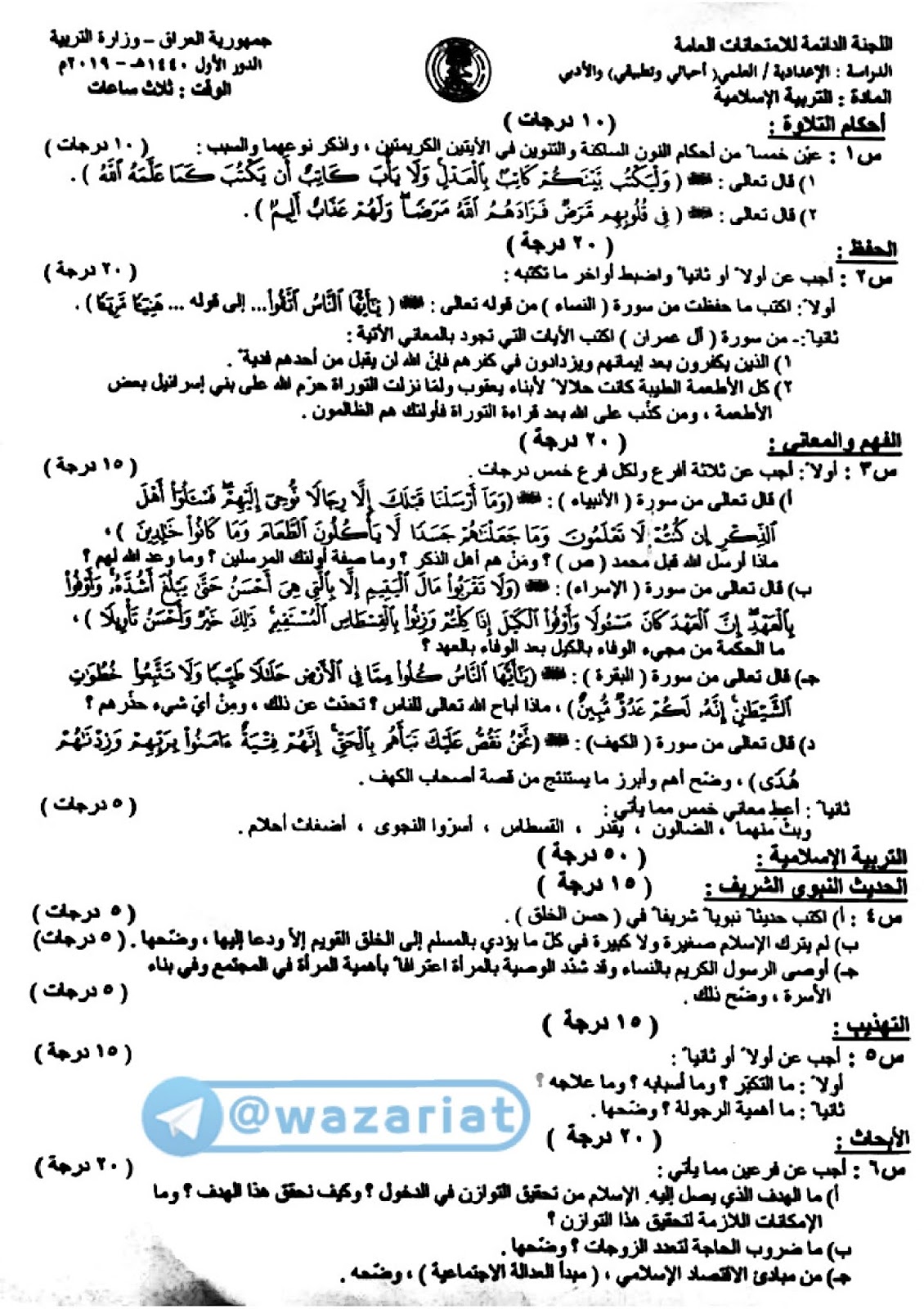 الاجوبة النموذجية مادة اسلامية السادس اعدادي 2019 دور اول
