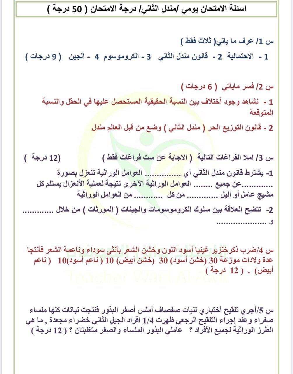اسئلة واجوبة امتحان يومي منزلي بمادة الاحياء سادس علمي مندل الثاني 2020