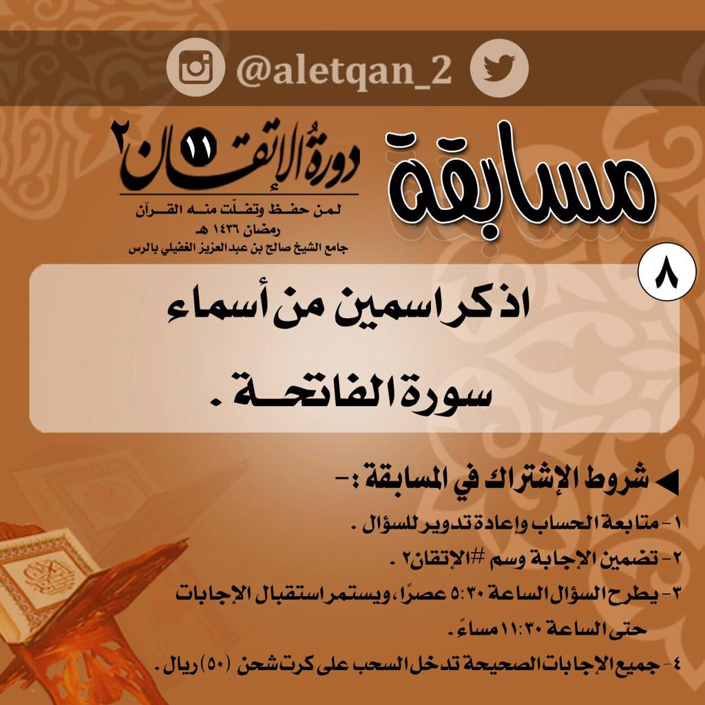 دورة اﻹتقان 2 Twitterissa سؤال اليوم الثامن اذكر اسمين من أسماء سورة الفاتحة الإتقان٢ ريتويت الفائزفي السحب يحصل على بطاقة شحن بقيمة٥٠ريال Http T Co 8adrqxrmvq