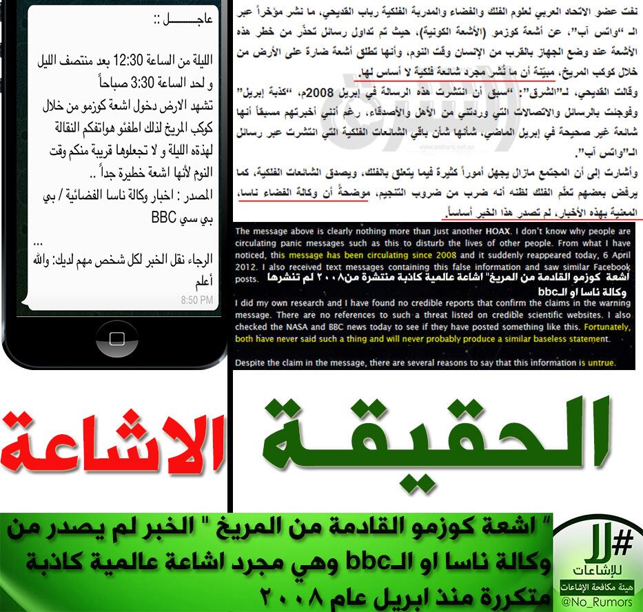هيئة مكافحة الإشاعات On Twitter اشعة كوزمو القادمة من المريخ الخبر لم يصدر من وكالة ناسا وهي مجرد اشاعة عالمية كاذبة متكررة منذ ابريل عام 2008 Http T Co Dtiof7vsxd