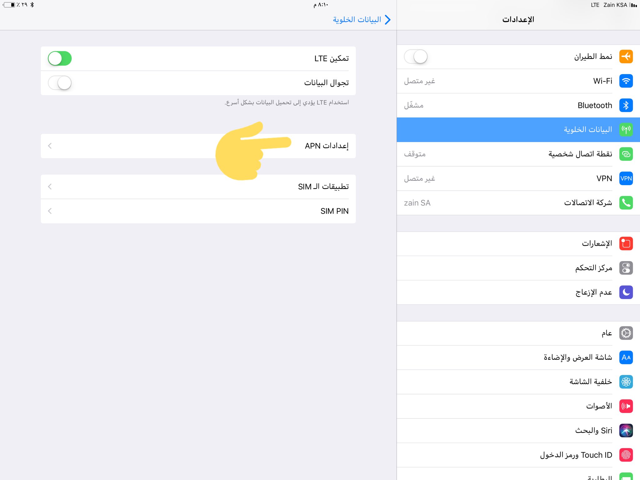 مدرسة الايفون No Twitter اذا كان عندك ايباد بمدخل شريحة وبغيت تشغل الفور جي ونقطة اتصال شخصية اتبع الآتي حط الشريحة في الايباد ونتظر ابراج الشبكة تظهر وبعدها ادخل الاعدادات