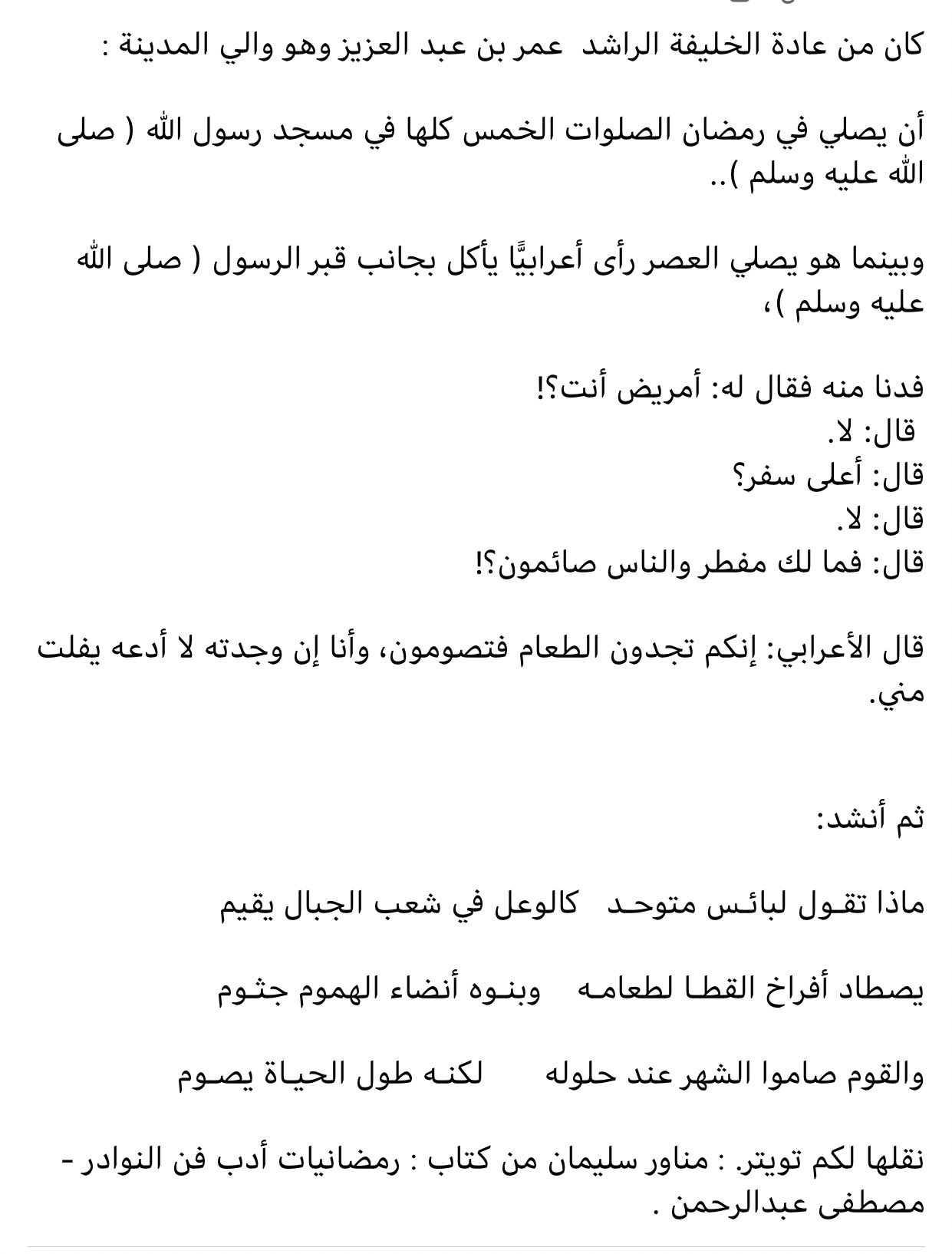 مناور سليمان On Twitter من عادة الخليفة عمر بن عبدالعزيز عندما كان والي المدينة أن يصلي في رمضان الصلوات الخمس كلها في مسجد رسول اللهﷺ و بينما هو يصلي العصر