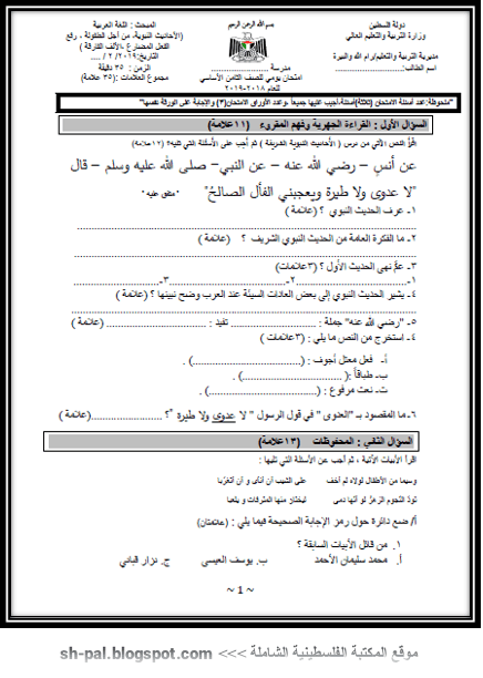 امتحان يومي في الوحدة الأولى لغة عربية للصف الثامن الفصل الثاني المكتبة الفلسطينية الشاملة